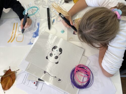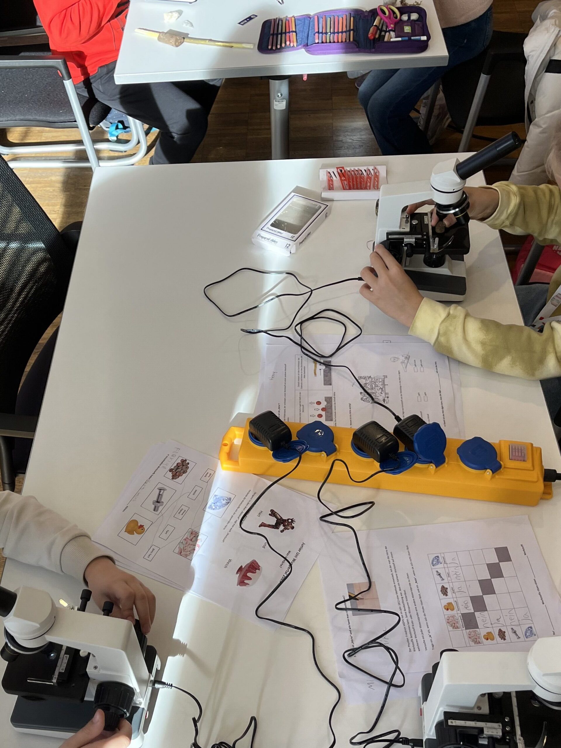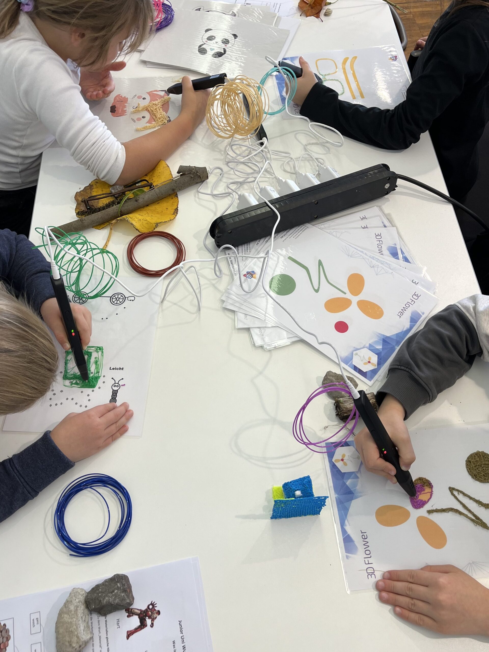 Eine Woche später ging es bei uns weiter. Die Schüler*innen untersuchten gutes und schlechtes Werkzeug, erfuhren, wie Forscher*innen gemeinsam mit Unternehmen neue Lösungen entwickeln, und probierten 3D-Stifte aus, um den Weg zum 3D-Druck spielerisch nachzuvollziehen. Aber auch ein Blick durchs Mikroskop durfte nicht fehlen. Dort entdeckten die Kinder spannende Strukturen von Materialien und Fundstücken aus der Natur.